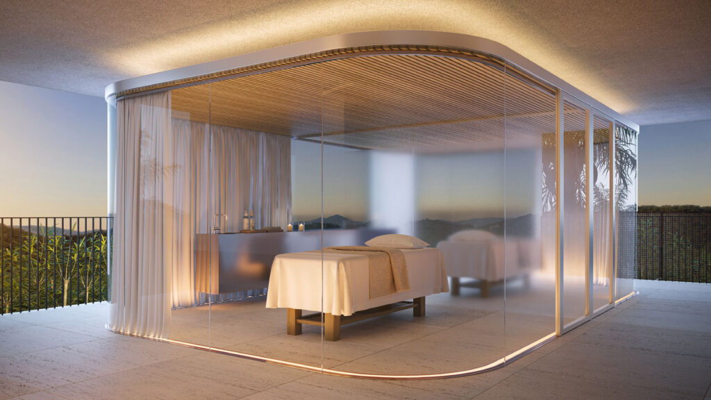 Piscinas e wellness Piscina aquecida de 27 metros revestida em Travertino, com prainha e bar exclusivo. Piscina infantil aquecida. Piscina térmica com raia. Sauna seca integrada à área molhada. Salas de massagem com projeto luminotécnico especial. Academia completa com equipamentos de primeira linha. Espaço de pilates aberto para o paisagismo.